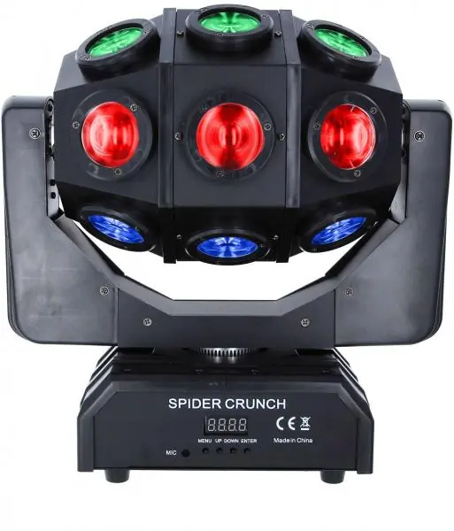 The Spider Crunch is an 18x10W 4-in-1 RGBW CREE LED effect.The Spider Crunch is a LED lyre made of a rotating roller with 6 rows of 3 x 10W RGBW LEDs (18 LEDs in total). This new spectacular effect allows a multitude of beams to be simultaneously cast in all directions, making it possible to energise a dance floor or a stage for a very innovative show. The combination of the PAN 540° and the infinite rotation of the mill is an excellent combination for new effects to boost your parties to the maximum. This compact and practical version fits easily into any venue with the added bonus of being easy to transport. Ideal for Discomobiles, DJs, Nightclubs, Bars, Dance Floors, Events and Stages
