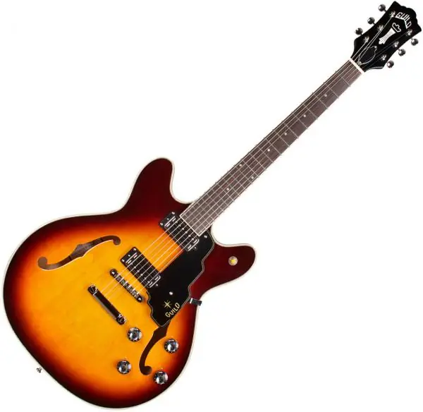 GUILD Newark St. Collection Starfire IV ST Maple (GU078) semi-hollow body electric guitar, marks the welcome return of a highly popular semi-hollow Guild classic, with a graceful double-cutaway thinline body and incomparable tone and feel. The original Starfire IV was prized by many guitarists from the mid-1960s onward as a distinctively rocking instrument, and its spirit and design pervade this new model. It’s a versatile guitar that will play Jazz, Blues, Rock, Pop or even Hard Rock. Other premium features include a rock-solid three-piece neck, special vintage-style LB-1 “Little Bucker” pickups and the classically brilliant Cherry Red. Also available in Black.Starfire IV : Mahogany body and Harp tailpieceStarfire IV ST Maple : Maple body and Stopbar tailpiece