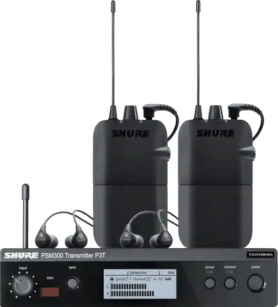The Shure PSM300 is a stereo wireless ear monitor.The PSM300 is a stereo wireless ear monitor that uses 24-bit digital hybrid FM technology to deliver high dynamic range audio quality and robust RF performance, while minimizing power consumption. Featuring Shure Audio Reference Companding, the PSM300 delivers warm, defined sound with low noise and no artifacts.Simple to set up and use, it features a frequency scanner to quickly find and assign a free frequency, as well as a level control directly accessible from the front of the transmitter.The system is available with either the lightweight and easy-to-use P3R receiver or the metal P3RA receiver with advanced features, LCD display and optional SB900A Lithium-Ion battery.The PSM300 is available in H20, K3E, and L19 bands.PSM300 Twinpack. Consists of one P3TE-K3E transmitter, two P3R-K3E transmitters and two SE112 earphones.