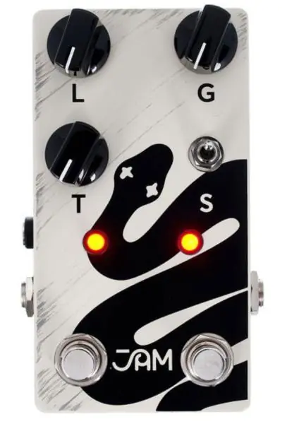 JAM PEDALS Rattler Distorsion MK2 will get you all the amazing tones of great early 80s ProCo RAT® distortion boxes and put in the time and R&D to make it more responsive to picking and fretting nuances resulting in an open, dynamic, overdriven tube-amp feel ! Its asymmetrical clipping circuit, carbon comp resistors stay the same but with the LM308 chips being long discontinued and hard to find, JAM developed a custom op-amp to ensure a dependable supply. Proprietary design, featuring discrete components, preserves the open, dynamic, and tube-amp feel that made the original Rattler so revered. These componets are the main ingredients of a great recipe resulting in the Rattler shining through any rig, whether modern or vintage. Enjoy fat and creamy distortion courtesy of the devious snake ! Used by Nels Cline, Bill Frisell, Kurt Rosenwinkel, Robert Randolph, Julien Kasper.WHAT’S NEW:1. MID BOOST:Use the second footswitch to engage a mid boost before the Rattler, adding new dimensions to your tone. Don’t think of this as a volume boost but as a tone enhancer! With internal controls for the boost’s level and bass content, we made sure it will deliver through any setup.2. CLIPPING OPTIONS:Use the onboard 2-way toggle-switch to choose between the new symmetrical and original asymmetrical clipping options for distinct feel and saturation profiles.3. Featuring click-less footswitching for smoother operation.4. You can also select the startup state of the RATTLER upon receiving power to be On or Off.