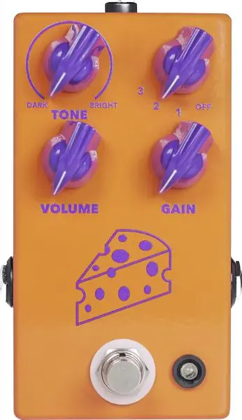 In the 1990’s, a new pedal company was created in England. Its ideas were off the beaten path, and its sounds were otherworldly. Despite existing only a few short years, these creations became the things of legend and one product in particular cast the biggest shadow. With such artists as The Edge (U2), Jimmy Page, Radiohead, Kevin Sheilds (My Bloody Valentine), Jeff Tweedy (Wilco), Gary Moore, and many others using the out-of-production units, their Used market prices have begun to rise more and more, sometimes into the $800 range. The JHS PEDALS Cheese Ball Fuzz effect pedal is a faithful and extremely accurate tribute/recreation of the original circuit.The Cheese Ball has your standard Volume, Gain, and Tone knobs found on most distortion fuzz boxes, but comes with an extra mode selector knob that gives you four different overall tone and gain selections. In the “off” position, the Tone knob is disengaged, giving you a bright and trashy fuzz/distortion sound. In the “1” position you have a mid-scooped sound that will give you a Big Muff style buzz for a rounded sound reminiscent of fine mozzarella that sits just right on your pizza but doesn’t get in the way. The “2” position is a mid-boost sound that will cut through a mix like a hot knife through Velveeta. Finally, the “3” position gives you a biting, gated fuzz tone that, when cranked, spits, spats, and bites like gorgonzola naturale.The Cheese Ball runs on 9V DC negative center power