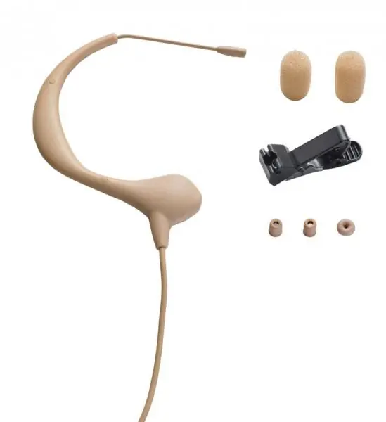 Headset microphone AUDIO TECHNICA BP893cW-TH MicroEarset Omnidirectional Condenser Headworn Microphone, less power module. 55” (1.4 m) permanently attached miniature cable terminated with a locking 4-pin connector for use with Audio-Technica cW-style body-pack transmitters. Includes AT8440 cable clip, two AT8157-TH windscreens, two AT8156-TH element covers, a moisture guard, and a carrying case.