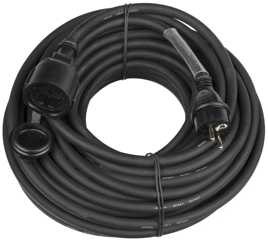 Soepele 3G2,5 stroomverlengkabel, lengte 20m, met pluggen met randaarde en een 7cm transparante krimpkous.