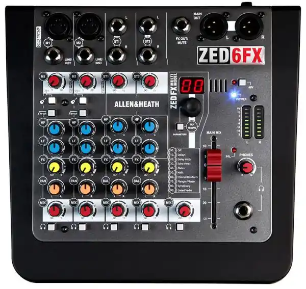 Compact 6 input analogue mixer with FX, ZED-6FX delivers Allen & Heath’s renowned build and audio excellence in a compact, portable format, making it the ideal choice for quality conscious musicians, singer / songwriters and venues. Whether it’s bouncing ideas around at home, performing live or recording tracks to share on YouTube and Soundcloud, ZED-6FX is a versatile companion for every step of the creative journey. Featuring the new GSPre boutique preamp design, developed from the revered GS-R24 studio recording console, the ZED boasts exceptionally low noise and massive headroom, with a signature analogue warmth and depth. ZED-6FX is the first mixer to include a specially created suite of studio quality reverbs, delays and special multi-model FX, crafted by Allen & Heath’s acclaimed in-house effects aficionados. Guitarists will be pleased to know that ZED-6FX comes with a pair of Guitar DI high impedance inputs, allowing guitars to be plugged straight into the mixer without the hassle and expense of carrying separate DI boxes.