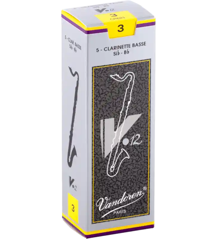 Basklarinet V12 rieten zijn gemaakt van rietstengels metdezelfde diameter als riet gebruikt voor altsaxofoonrieten. Als gevolg hiervan hebben ze een dikkere hiel en zijn ze op een langer palet gesneden met een iets dikkere punt dan de Traditional. Het langere palet betekent dat meer van het riet trilt, wat resulteert in een dieper, rijker geluid.De dikkere tip geeft body aan de attack en verlengt ook de levensduur van het riet.De introductie van de 3.5+ sterkte maakt een kleinere en meer specifieke gradatie mogelijk, wat resulteert in rieten die consistenter zijn binnen dezelfde sterkte.