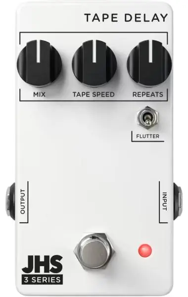 Tape delay was invented in the late 40s when Les Paul strung two Ampex Model 200A reel-to-reel tape recorders together. A little later, in 1953, Ray Butts invented the Echosonic, the first actual tape delay unit. This would be followed up by the Echoplex EP-1 in 1961 from Mike Battle and the Space Echo from Roland in 1974.The JHS PEDALS 3 Series Tape Delay is a simplified and faithful throwback to these classic units. The Mix control lets you control how much clean signal is blended in with the wet (delayed) signal (on the original unit, this was called Echo Volume). Tape Speed acts as a simulation of the RE-201’s tape motor speeding up and slowing down and determines how short or long the delay effect is. The Repeats control goes from a single repeat to many, reminiscent of a sound being written onto the tape loop with loss of fidelity each time. Finally, when the Flutter toggle is turned on (up position), it replicates the wear & tear to the mechanical parts of a tape machine that happens over time. This causes mild modulation, warble, and flutter sounds in the echo path of the delay that so many players desire.