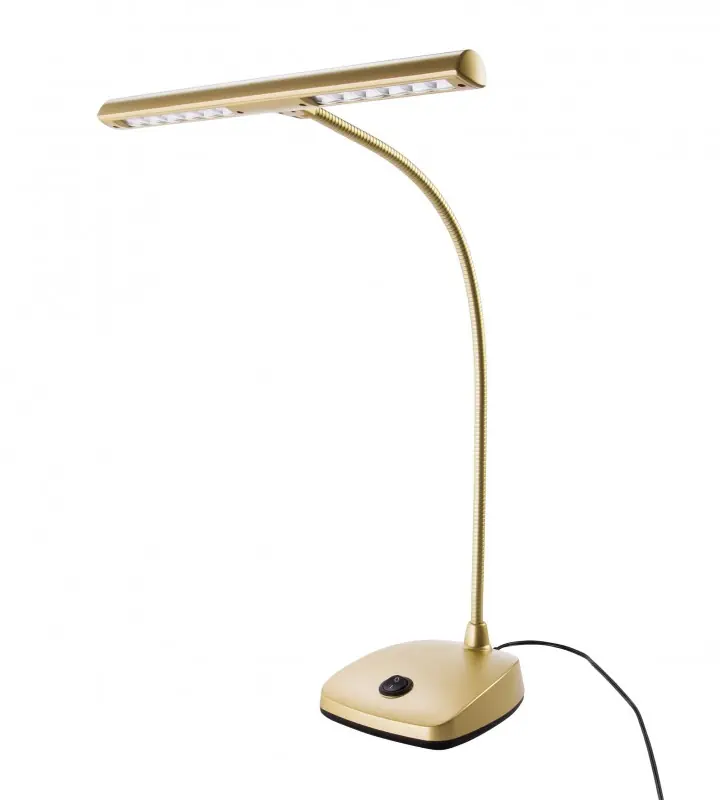 12297 LED Piano Lamp – GoudPiano lamp met een elegant design , perfect voor het podium en digitale piano’s. State-of -the-art LED- technologie garandeert een helder licht (12 LED’s , 2500 Lux), een lange levensduur en een laag energieverbruik .Optimale plaatsing dankzij een lange, flexibele zwanenhals (lengte 405 mm).Zware voet zorgt voor een stabiele positionering.Inclusief adapter .Specificaties: Aansluiting: elektrische kabel 3 m Elektrische aansluiting: 230 V AC 50Hz Intensiteit: ~ 2500 luxLamp schacht lengte: 296 mmLicht positonering door: zwanenhalsVerlichting door: 12 LED’sMateriaal: voet gegoten zink, zwanenhals staal, lampenkap kunststofVoeding: alleen 220 VoltKleur: GoudGewicht: 1,6 kg