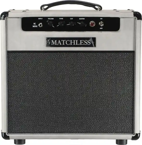 Electric guitar combo amp MATCHLESS Sc mini – gray/silver.Several years of R & D went into the creation of the SC-Mini.The ultimate goal was to create an entry level, highly affordable Matchless amp while staying true to our quality based principles in performance and sound.The result is a tube amplifier constructed with a single PC board based on Channel 2 of the larger Matchless C-30 Series. The SC-Mini was created to be an affordable, entry level Matchless amp that can be used in the studio as well as smaller performance venues where a lower volume output is essential.It took several years of design and refinements by Phil Jamison in order to create an amplifier at an attainable price point while staying true to our quality based principles in performance, sound and construction methods.The result is an all tube amplifier constructed with a single PC board based on Channel 2 of the beloved Matchless C-30 Series.In order the achieve the affordable price point, the chassis is constructed off site under the strict supervision of Phil Jamison and then finished in house and assembled into our handmade speaker cabinets before undergoing rigorous testing.Each SC-Mini is loaded with the same customized Celestion Heritage G12H30 that is used in all of our amp and speaker cabinet models.Each SC-Mini also includes our signature hand wired back lit MATCHLESS logo. Also, like the C-30, the output section is powered by the EL84 power tube however, the SC Mini has a single ended output transformer using only one EL84/6BQ5 tube, thus making the SC Mini a true “Class A” amplifier.With a 5AR4/GZ34 tube rectifier, one EL84, one EF86, and one 12AX7 the SC-Mini has the same classic tone and feel as the C-30 industry standard, simply scaled down in size and volume.Features: Volume, 6 Position Rotary Tone Switch, Cut Control, and Master Volume.