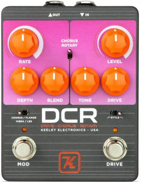 KEELEY DCR Drive Chorus Rotary compact effect pedal allows to perfectly blend two fully separated channels,crunch ou lead distortion and chorus/flanger/rotary speaker cabinets.!The KEELEY DCR is an easy drop-in for a rhythm or chord work pedal.The DCR has a highly saturated, perfectly compressed, tube-gain tone. There are two drive profiles; one being full-range and highly saturated, the other drive mode combines a slight shelf filter and low-pass filter, perfect for warming up or thickening any guitar.In and Out jacks double as TRS inserts and allow you to insert any effect in between the drive and chorus.The drive section feeds into one of two types of modulation: a chorus/flanger pedal or a rotary-speaker swirl.In a visual nod to the Ibanez Sesh-Man, the DCR combines the drive and chorus combo experience of that pedal, but with the thick modulated tone of the old TC line cord choral/flange or the unique tone-stamp of a rotary speaker!Keeley designed rotary speaker tones are known for being lush and EQ’d in a way that captures the magic of those 3D mechanical choruses. Choose between a Vibra and Les mode to create a vintage organ tone. Choose between Chorus and Flange mode to give a thick, doubling chorus or a syrupy, slick flanger tone.