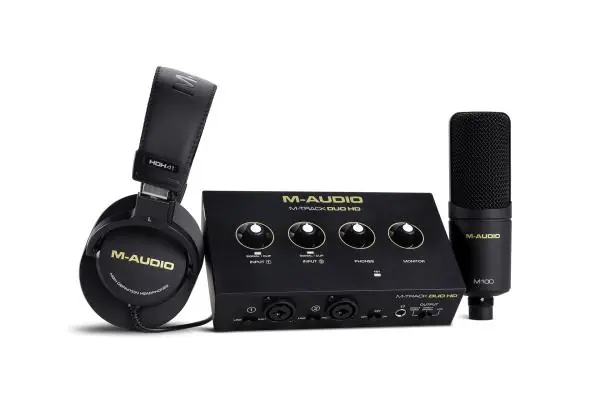 Het M-Track Duo HD-pakket bevat een 2-in/2-out USB-C audio-interface, een condensatormicrofoon en accessoires, en een studiohoofdtelefoon.