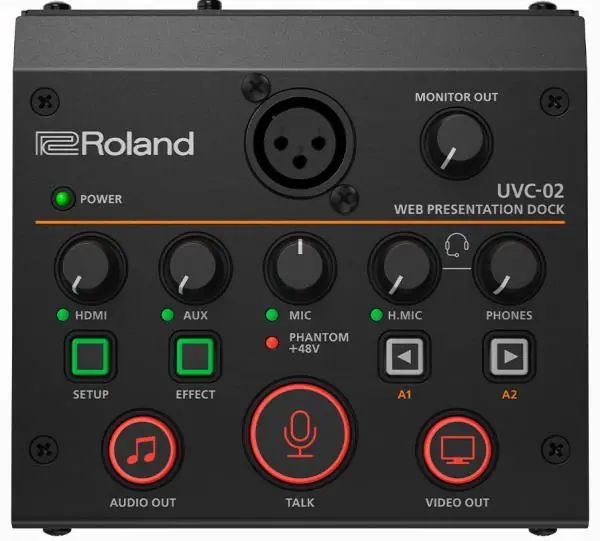– The Roland UVC-02 is an easy-to-use connection platform for usinga high quality camera and microphone with video conferencing software.- video conferencing software.-The use of streaming video for work or leisure has become very common. But you will never never get the best sound and images using your computer’s webcam and microphone.- Roland’s UVC-02 Web Presentation Dock helps compensate for this shortcoming by providing a simple and affordable way to enhance the sound and image of your online presentations, and get more out of youronline presentations, and gain more control.