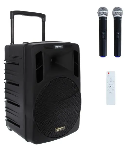 The POwer acoustics BE 9412 Media v2 is a portable MP3/SD/USB/Bluetooth sound system + 2 UHF Main microphones.Remarkable evolution of the BE 9412 V2, well known in the field of portable systems with batteries. The BE 9412 MEDIA V2 has all the qualities of its predecessor, with its ABS finish and new professional design, but without the CD player. An ultra complete multimedia player will allow you to meet all current expectations. Compact and powerful, it will be perfect for any type of conference, speech or presentation.