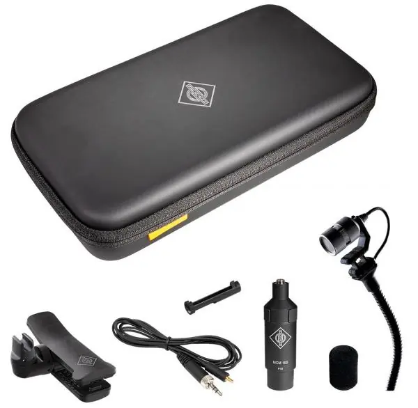 Complete set of the Neumann Miniature Clip Mic system for trumpet, trombone, saxophone, french horn, percussion instruments.Complete set for using the MCM Neumann Miniature Clip Mic system on the bell of a trumpet, trombone, saxophone or other horn, on percussion instruments and on poles. Contains: Capsule KK 14, gooseneck SH 150, cable clip KC 1, cable AC 31, output stage MCM 100, windscreen WS 110, clip MC 6. Supplied in a practical soft case.