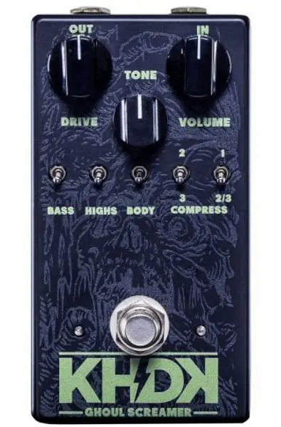 The KHDK Ghoul Screamer Overdrive is a multipurpose compact effect pedal, a true utility knife of overdrives. The dramatic versatility of the controls spans from a clean boost all the way to a massive overdrive. In addition to the three standard controls (Drive, Tone, Volume) five mini toggle switches have been added, offering enhancement for Bass, Highs, and Body, as well as two variations of Compression.This hugely enhances your sound palette and elevates the Ghoul Screamer to the highest class of stage and studio gear.”You’ll be hard pressed to find a more versatile overdrive.”– Premier Guitar Magazine”When it comes to boosting and tightening up metal tones, the Ghoul Screamer is among the best TS-alikes we’ve used.”– Music Radar