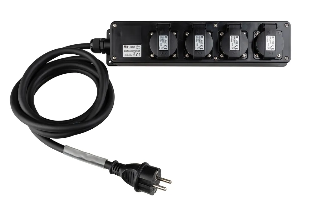 Professionele stroomverdeeldoos met 4 stopcontacten met penaarde, een 3G2,5 rubberen kabel van 5m, schuko plug met penaarde en een 7cm transparante krimpkous.