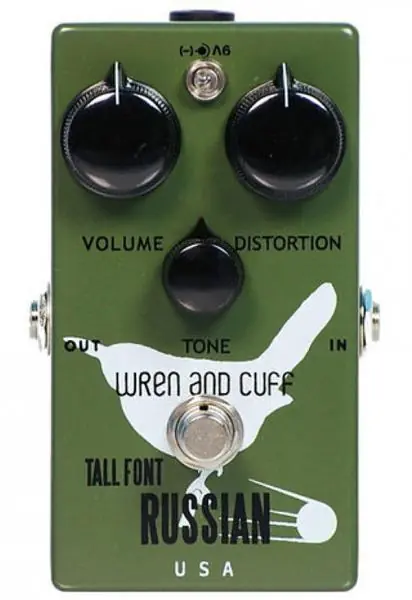 The WREN AND CUFF Tall Font Russian Fuzz compact effect pedal is great on bass, and fantastic for raunchy, less friendly guitar tones ala The Black Keys, White Stripes, Mars Volta, and many others seeking a nasty F-You snarl (not saying the afore mentioned bands use these exact pedals, just using their tones as a reference).With many other desirable muffers the goal is warm, smooth and buttery, but the TFR has a different goal in mind. There is a growl and raunchy yet truly musical sound produced by these ugly green beasts. The lows have an overdrivey compression that keeps things tight, and the highs have a rich upper-harmonic thing going on that’ll make one understand the affection some have for this pedal. The mids have the standard muff-scoop but it is not as pronounced as some of the other generations. Add to that a less gainy/fuzzy tone overall and you end up with a unique muff with a character all its own.