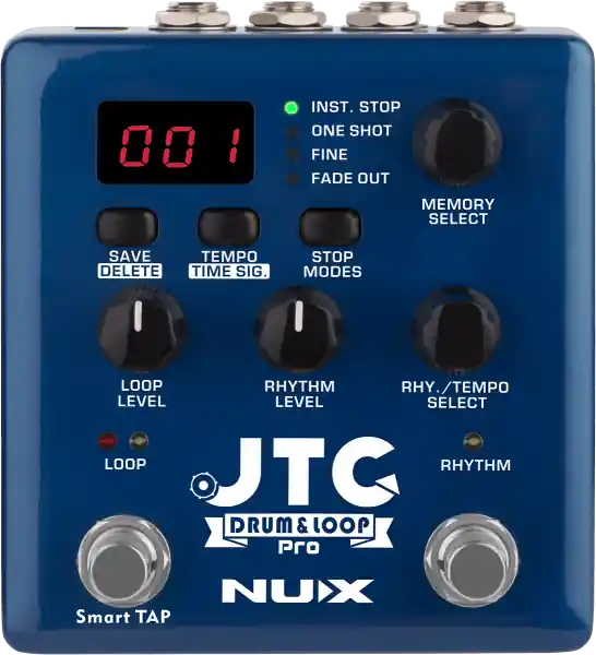NUX Verdugo Series JTC Drum & Loop PRO NDL-5 Dual Switch Looper Pedal compact processor offers 6 hours of recording and 256 loop track memories. Available drums patterns are 25x 4/4 beats, 10x 3/4 drum beats and 5x shuffle beats.It has independent controls for the looper and the rythm box. You can connect the optional NUX NMP-2 control footswitch into this jack for switching phrase memories. Its seamless switching allows you to arrange different verses and choruses and play the whole song! You can load your favorite songs and backing tracks into JTC Pro to play along. Supported file type is 24-bit / 44.1kHz Stereo WAVE (.wav)