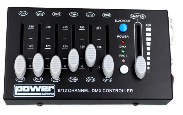 the Dmx Minishow 12c is a 12-channel DMX controller.The DMX MINISHOW 12C is a 12-channel mini DMX controller on 2 pages A and B with 6 “Linear Faders” and a Master Dimmer very useful to precisely dose the lighting and create atmospheres. Very practical for simplified use, everywhere and without taking up space. Ideal for managing lighting effects, decorative lighting and/or specific areas.Power supply transformer included.