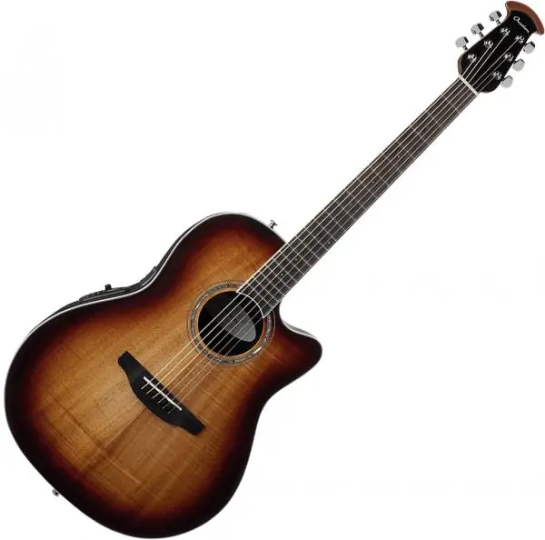 OVATION Celebrity Standard Exotic CS28P-KOAB, acoustic/electric guitar, layered Koa top, Super Shallow Lyrachord body, Ovation OP-4CT preamp with tuner.For the player who loves the performance of the Ovation Celebrity Collection, but is looking for a step up that is an inspiring thing of beauty, the Celebrity Standard Exotic is for you. The only thing “standard” is the traditional center soundhole design. This model features a stunning Koa top with a burst finish. Just like all Celebrity Standards, these guitars just feel right thanks to the effortlessly playable satin-finish neck, the 10″ radius fretboard and the way the top responds. The center soundhole gives back clear and loud resonance thanks to scalloped-X bracing support. For live performance, the Celebrity Standard includes an Ovation Slimline pickup and OP-4CT preamp system with a three-band EQ and onboard tuner. A super shallow, Lyrachord® composite body is deep enough to offer warm low end, but shallow enough to play comfortably. When you want to create, write, play, or perform… the Celebrity Collection is ready and the exotic tops offer a variety of stunning finishes.