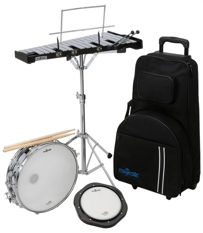 Majestic percussionkit model 1432DPKlokkenspel met stander en trolleytasIncl. snaredrum, een paar stokken en een oefenpadMajestic percussie kits zijn ontworpen om spelers de beste kans op succes te bieden.De materialen zijn robuust en duurzaam, met hoogwaardige toetsen, snaredrums en oefenpads.De beschermende koffer zorgt ervoor dat de kits veilig en comfortabel kunnen worden vervoerd..
