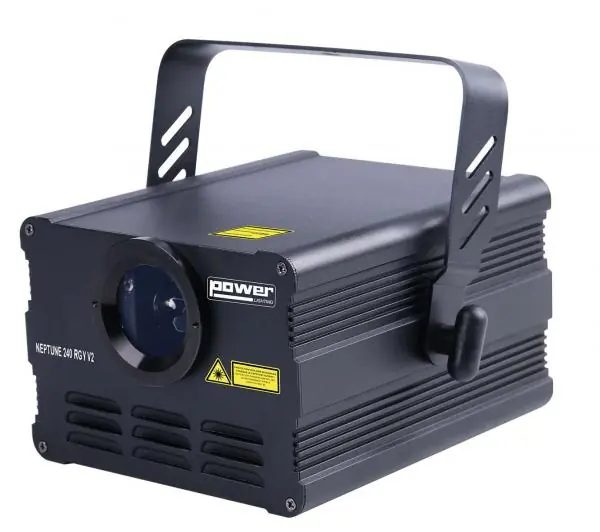 The power lighting neptune 240 RGY V2 is a R200 MW V50 MW beam laser.The POWER LIGHTING NEPTUNE 240 RGY V2 is a 3 colour laser with red, green and yellow beams. It has 4 operating modes: Auto, Musical, DMX and remote control. Supplied with its mounting bracket and infrared remote control, it will be ideal for parties, small performances, weddings, bar ambiance. Laser for professional use.