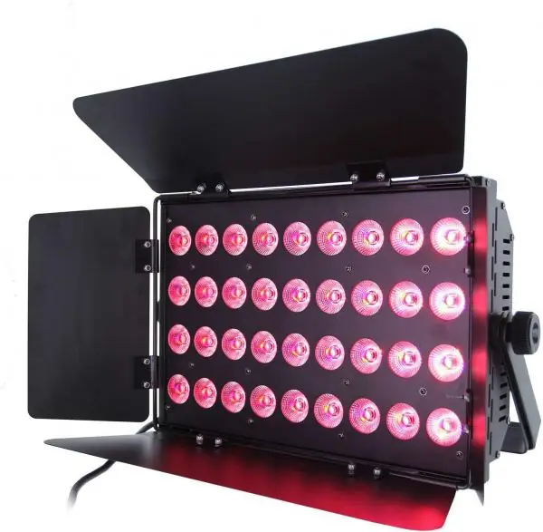 the Power lighting PANEL 36x10W RGBWAUV.The LED WASH 36x10W RGBWAUV is a LED projector with 36 x 10W LEDs and 6 colours including UV. Very practical for the stage as well as for architectural purposes, it can be used to illuminate various facades of buildings, monuments and/or concerts. The different integrated progressive colour change programmes (very slow to very fast) and the stroboscopic mode make it easy to use during your various performances. The adjustable shutter allows a precise delimitation of the beam aperture, which is very useful for a clear and smooth performance, also allowing for possible glare depending on the positioning of the device. The DMX is also there for more manoeuvrability. In addition, the UV allows this fixture to be used in a variety of ways and increases the possibilities for more varied and richer colours through colour mixing.