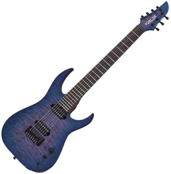 SCHECTER Keith Merrow KM-7 MK-III Pro USA is a top notch signature seven string / baritone solid body electric guitar. Features Swamp Ash/flame Maple body, neck-thru construction, 24 frets Ebony fingerboard, Fishman Fluence Keith Merrow Custom Humbucker (Alnico V magnets, 3 voicings) and Hipshot bridge and tuners. A splendid and versatile Metal guitar.