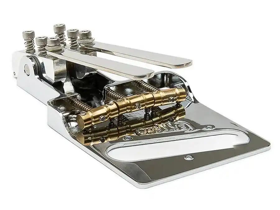 Features: – Drop-in replacement for most vintage-spec Telecaster bodies. 100% reversible.- Bends B and G strings up a half or whole step.- Levers can be used independently or in combination.- Tension-loaded stainless-steel arms for perfect positioning.- Ensures comfortable operation in normal playing position.- Compensated brass saddles for accurate intonation and vintage tone.- 2-1/8″ string spacing.- Front-slotted intonation screws for easy adjustments.- Available in Nickel and Chrome.- Includes 1/16″ and 3mm allen wrenches