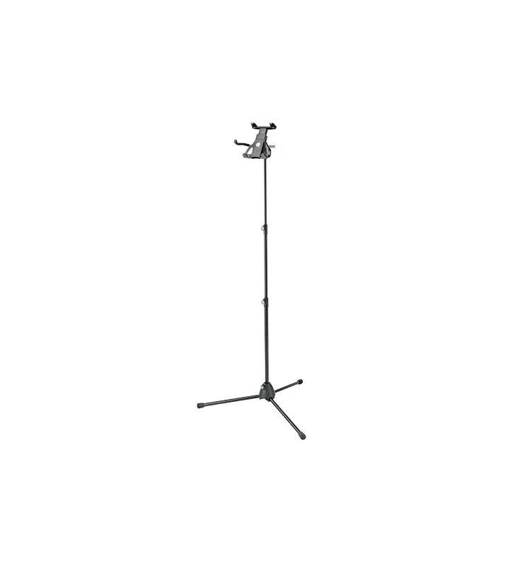 De combinatie van de standaard en de tablet-pc-houder ondersteunt u op het podium, thuis of in de studio. Het unieke klemmechanisme bevat alle gangbare Tablet PC-modellen zoals iPad mini, iPad, iPad Air, iPad Pro, Amazon Kindle, Amazon Fire, Samsung Galaxy Tab, Google Nexus, Asus Transformer of Microsoft Surface in afmetingen van 120 tot 222 mm veilig en veilig. De houder is met name geschikt voor het gebruik van tabletten met beschermende schilden of kisten. Dankzij een trekveerklem kan een tablet in een handomdraai in de houder worden bevestigd en verwijderd. De universele grijpinrichting met geïntegreerd mosrubber garandeert een goede grip en elimineert ongewenste trillingsgeluiden. De extra verstelbare beugel bedekt met vilt en rubberen doppen biedt extra veiligheid bij het instellen van de tablethouder in de portretformaatpositie, zodat de tablet-pc niet loskomt van de houder, zelfs in de meest ruige faseomgevingen. De klemgrepen zijn verstelbaar, zodat u gemakkelijk toegang hebt tot de functies van de afzonderlijke apparaten. De tablet-pc kan worden geschakeld van de staande naar de liggende positie en vice versa zonder te glijden. De tweedelige hengelcombinatie kan op elke hoogte tussen 700 en 1550 mm worden ingesteld. De standaard klapt tot een klein en compact formaat voor een gemakkelijk transport.