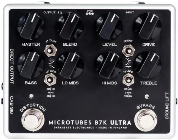 The DARKGLASS ELECTRONICS Microtubes B7K Ultra V2 bass preramp/distortion effect pedal, features all the versatility and sonic possibilities original B7K is known for plus amazing features :- dedicated Footswitch to engage the overdrive section independently.- Master volume to control the overall unit level.- Three way toggle switches for each mid control, with a total of 6 different mid frequencies at your disposal the B7K Ultra allows you to create and tailor your tone to perfection: From crisp, punchy clean preamp to obliterating high gain distortion, and everything in between. The B7K is an universal tone crafting machine.- Single user loadable cabinet simulation impulse response- Micro-USB B port to connect to PC/Mac to load a different Virtual Cabinet through the Darkglass Suite- 3.5mm headphone output with cabinet simulation- Balanced XLR output with switchable cabinet simulation