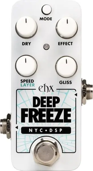 Meeting between the original Freeze and Superego pedals is the Pico Deep Freeze Sound Retainer. With the ability to freeze a moment in sound, the Deep Freeze can act as a sustain pedal for holding chords and notes as backing for your playing or as a platform to manipulate your tone into new sounds impossible with a normal guitar. In addition to the original Freeze’s abilities, the Deep Freeze features layering, adjustable attack/decay speeds, glissando, dedicated volume controls, and 3 modes: Latch, Moment, and Auto, making it powerful pedal punching well above its weight.The Deep Freeze allows for instant sound freezing in three modes of operation. Latch freezes sound each time the footswitch is pressed until the effect is bypassed, while Moment mode freezes sound only while the footswitch is held down. Auto mode captured sound automatically each time it senses signal above its threshold for virtually foot-free freezes. These three modes make it easy to operate the Deep Freeze in a way that fits any playing style.Controls on the Deep Freeze let you further tailor the operation of the effect. Separate DRY and EFFECT volume controls let you blend signals from subtle backing to 100% effect experimentation. GLISS adjusts the morph time between freeze sounds creating otherworldly soundscapes. The SPEED/LAYER knob adjusts either the attack/decay time of the effect in Moment and Auto modes, or the amount of layering possible in Latch mode which makes playing impossible chords possible!