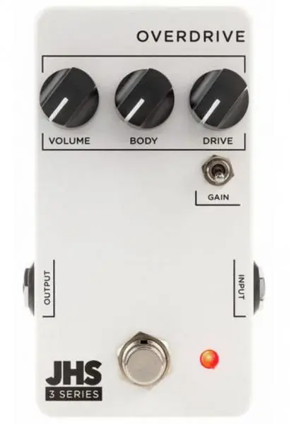 The JHS Pedals 3 Series is a collection of pedals designed to give you affordability and simplicity without compromising quality. Each 3 Series pedal is made by us in Kansas City, MO, using high-quality parts, quality control, and attention to every detail. Each pedal has three simple controls and one toggle that offer a wide range of sounds, perfect for beginners and professionals alike. The JHS Pedals 3 Series will inspire your playing and help you explore new sounds at a totally approachable price point. The JHS PEDALS 3 Series Overdrive compact effect pedal offers a wide range of overdrive sounds within straightforward design aesthetics. You can achieve anything from boost, transparent low gain, to huge amp-like medium overdrive sounds. The simple knob functions give you control over the Volume, Body (or EQ), and Drive. The Gain toggle gives you a choice between more saturated and compressed or more open and crunchy dynamics. This switch plays a big part in how the pedal responds to your playing and touch as a player. The JHS Pedals 3 Series Overdrive runs on 9V DC Negative Center power and consumes 12mA.