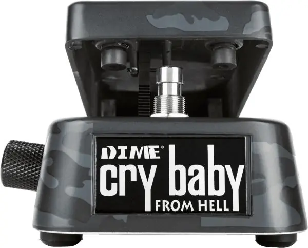 The JIM DUNLOP Dimebag Cry Baby From Hell Wah DB01B effect pedal, the most versatile wah in Jim Dunlop line up, was designed for players who need options on stage, featuring an extended sweep rang a 6-way frequency selector, a switchable boost, LEDs to indicate wah and boost status, and more. Dimebag Darrell combined a cowboy’s swagger with high-gain riffs and squealing pinch harmonic-laden leads. One of the most significant elements of his sound and dynamics was the Cry Baby Wah, and at a time when wah pedals had fallen out of fashion, Dime flew his wah flag high. Armed with his hard-earned expertise and insight from years of touring, he helped JD devise the a hell of aversatile wah. Work on this pedal first began some 20 years ago when Dime, a long-time user of the super customizable Cry Baby 535Q Multi-Wah, wanted even more freedom when setting up his rig on stage.Starting with the 535Q, JD carried over its Q control, 6-way range selector, and adjustable kick-in boost. Next, JD hot-rodded it with a wide sweep range for Dime to dig deep and fly high, a control to adjust the pedal’s toe-down frequency, an extra output for splitting your signal to a separate FX chain, and back-mounted LED indicators to conveniently show whether the wah is on and whether the boost is engaged.Finally, JD team replaced the standard rubber tread with skateboard skid tape so that your foot doesn’t slip on any spilled beverages. The Dime Cry Baby from Hell Wah is the ultimate wah pedal for your touring rig, and with its new black camo finish, it’ll have you wearing a black-toothed grin in no time.