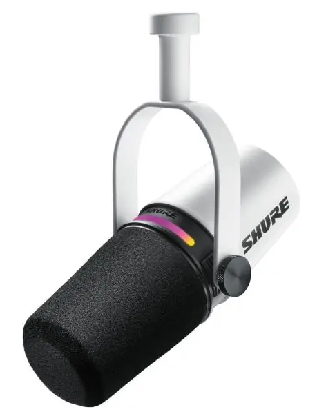 The MV7+White represents an XLR-USB-c podcast microphone offered by Shure.