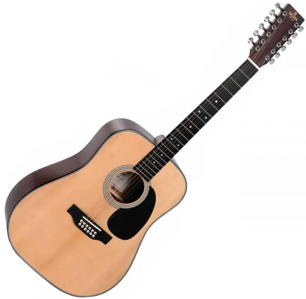 The SIGMA 1 Series DM12-1 12-String is an acoustic Dreadnought guitar, featuring solid Sitka Spruce top, layered Mahogany back/sides/neck and Micarta fretboard. Micarta, a composite of linen, canvas, paper, fiberglass and carbon fiber, sounds close to Ebony.