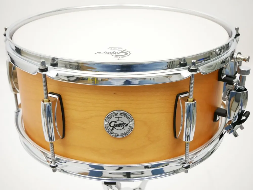 Gretsch snaredrum 13″ x 6″ in berken model Full Range8-laags berken ketelSatin Classic Finish30° bearing edge2,5 mm steel hoopsSnare wire 20 spiralenGretsch vellen made by Remo