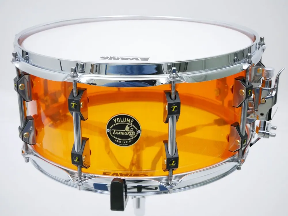 Tamburo snaredrum 14″ Acrylic ketel in oranjeDe VOLUME snaredrumserie is gemaakt van methacrylaat met een dikte van 3,5 mm.Ze zijn niet alleen ultralicht van gewicht, maar bieden ook een ongelooflijk breed stemgebied—geschikt voor alles van lichte jazz tot heavy metal..