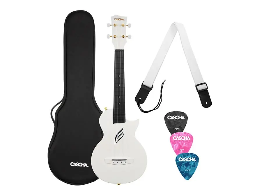 This bundle includes a 5 mm padded soft case, a ukulele strap & three picks.
