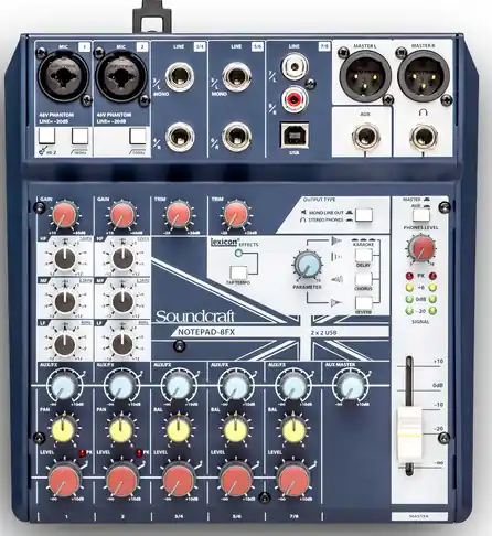 TheSoundcraft NotePad-8FXis a console with USB and Lexicon effects, 6 inputs, 2 outputs.The Notepad series features premium mic preamps, XLR / jack connections and a heavy-duty metal chassis.This console incorporates a headphone level control, a master level with LED level, and each microphone channel has 3 EQ controls.The Notepad series includes several models, all very compact, designed to be carried everywhere.This model also incorporates a USB audio interface, allowing you to record your signal directly into an audio-digital sequencer, as well as an embedded Lexicon effect section.