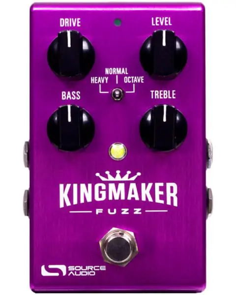 The SOURCE AUDIO One Series Kingmaker Fuzz programmable / stereo compact pedal features three killer fuzz tones including a highly saturated yet articulate fuzz for violin-like lead tones and pummeling rhythm, a responsive fuzz that cleans up nicely with reduced input signal, and an octave circuit that unleashes a screaming, octave fuzz in the style of vintage Octavio pedals.Connect the Kingmaker to the Neuro Desktop Editor or Mobile App (free download for iOS,Android, Mac, and Windows) and access a massive collection of additional overdrive, fuzz and distortion tones with extended parametric EQ capabilities, stereo routing options, and internal stacking functionality.