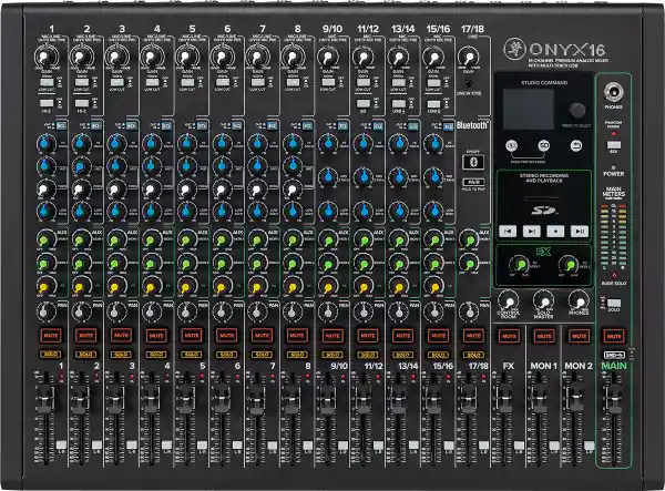 The Mackie Onyx 16 is a 16-channel mixer with USB interface.Ultra-clean and quiet performanceOnyx microphone preamps with up to 60dB gain at high listening heightsFull multitrack recording via USB with up to 24-bit/96 kHz qualityRecord a stereo mix directly to an SD card and play back music filesProfessional and customizable built-in effectsOnyx Studio Command – Color display makes it easy to control effects and manage SD cardsPerkins “British Style” EQ delivers classic 60s and 70s sounds with modern performance and precisionPlay music directly on a channel via Bluetooth®.