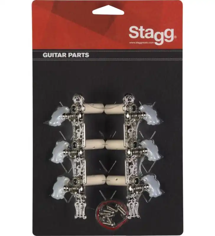 Set mechanieken (3 links, 3 rechts) voor klassieke gitaar- Witte plastic knoppen- Luxe-uitvoeringVernikkeld