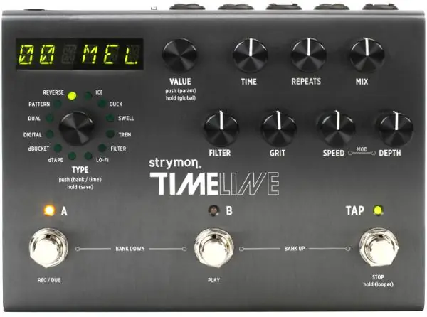 STRYMON TimeLine Multidimensional Delay is astudio-class stereo delay compact effects pedal, that goes beyond what has been done in the past—in sound quality, sonic flexibility, hardware design, and processing power.Strymon team spent months locked up in the Strymon sound design labs dreaming up the most spacious, lush, creative, and tweakable delay effects ever heard. It was a monumental task—a relentless study of delays and their nuances, and a continuous pursuit of innovative and musically inspirational sounds. Utilizing a ridiculously powerful SHARC DSP, every drop of processing power is harnessed.TimeLine provides you with twelve unique delay machines, each with extensive control over sonic character and feel. Go from crisp and clear, studio-quality digital delays all the way to the saturated and fluctuating sounds of tape delay machines. Get warm and fuzzy analog style repeats all the way to shimmery, sparkling, and crystalline ice delays. Tweak to your hearts content and save up to 200 presets of your favorite sounds. Top it all off with full MIDI implementation and a routable, 30-second stereo looper and you’re on your way to delay bliss. Plug in an expression pedal and control any knob or combination of knobs, all saveable per preset. Or plug in an external momentary Tap Tempo switch for remote control of your tap tempo.TimeLine comes with a built-in 30-second stereo looper, routeable pre- or post-delay.Record, overdub, play, and stop are right at your feet. Record the delay signal to your loop, or route the looper before your delay and saturate your dry loop in echoey goodness. Super simple to use and a ton of fun. You can also control the looper with a MultiSwitch or external MIDI controller to access reverse, half speed, undo-to-initial-loop, and redo functions.Digital – A crystal-clear digital delay that can be endlessly tweaked and enriched with the Filter, Grit, Smear, High Pass, and Modulation controls. A wide range of delay tones can be achieved with this classic “voiced” digital approach. In addition, a non-linear mode allows the repeats to fade more quickly, while still retaining a natural feel. Dual – Two independent delay lines can be configured in series or parallel (right/left split). The second delay has independent Mix, Repeat and Time values, and can also be set to track the first delay’s knob values. Pattern – The Pattern machine gives you a variety of multi-tap patterns that span from rhythmic to ambient to percussive and everything in between. Filter, Grit and Mod knobs deliver a wide range of delay experiences. Reverse – You play frontwards, it repeats backwards. Your playing triggers the delays, producing predictable, repeatable, and extremely useful reverse effects. Add some Smear to soften the attacks—smearing transients while retaining full frequency response. Ice – The Ice machine slices and dices your input and plays the pieces back with a selectable Interval shift amount—from an octave down to two octaves up, and anywhere in between. You can Blend the ice amount from none to all. Selectable Slice size allows further possibilities, changing the size of audio chunks that get shifted. Duck — and cover. You get a ducking delay with adjustable Sensitivity and Release Time, along with a switchable Feedback duck option. This allows for a wide variety of dynamic delay effects. Swell – Variable swell time allows you to match the swell with the delay time. Turn the Mix to full wet and turn up the repeats for ethereal ambient effects. Adjust the Rise Time to set the time constant for the swell effect. Add some Smear to soften the attacks—smearing transients while retaining full frequency response. Trem – The Trem delay machine provides you with a synchronized tremolo with Waveshape, Depth and Speed for cool new sounds. Choose from triangle, square, sin, ramp, and saw to vary the delay amplitude. Filter – The Filter delay gives you a synchronized Filter that can be placed before or after the delay. Waveshape, Depth, Speed, Resonance, and Filter Location are all adjustable parameters. Choose from triangle, square, sin, ramp, saw, random, up, and down to vary the delay amplitude. Limitless filter possibilities! LoFi – Crush some bits with the Lo-Fi delay machine. Adjust Bit Depth and Sample Rate while blending the results with the full resolution signal. Select from several hand crafted lo-fi Filters, spanning transistor radios, telephones, phonographic horns, and other “collectibles”. Top it off with our exclusive dVinyl record noise, adding a scratchy record complete with dust and dirt. dTape – The dTape machine delivers the complete experience of sought-after sliding-head tape echo machines, with every attribute relentlessly studied and faithfully recreated. Full control over Tape Age, Wow & Flutter, Tape Crinkle, Tape Bias, Low End Contour, and Tape Speed. dBucket – The dBucket machine provides you with a deep and nuanced recreation of analog bucketbrigade style delay types. Two delay time ranges are available, for single or multiple BBD chip delay times. Utilize our exclusive Bucket Loss control, along with dedicated Filter and Mod controls.