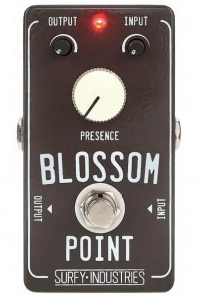 The SURFY INDUSTRIES Blossom Point compacte effect pedal emulates the special “fat effect” that is obtained by pushing the tubes and the volume of a brownface Fender® Showman® just before distortion. It finds that “sweet spot” (that Dick Dale was calling the “blossom point”) of maximum tube compression that changes the entire sound – from its power to the sustain of the guitar and the reverb.The Blossom Point is perfect for the gigging artist who appreciates that sound or is used to playing through one of those old amplifiers.As we know, for live shows and touring, you can be presented with different backline amps and traveling lighter and avoiding bringing a brownface amplifier on the road is always a plus. It saves you money and your back ! With the Blossom Point you are secure in knowing you can get the sound you need from any amplifier, even the coldest ones, with affordable ease and portability.