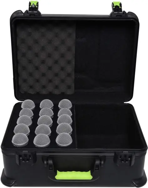 The Shure SH-MICCASE15 is a durable ATA-style case designed specifically to hold 15 wired microphones, with additional storage space for cables and accessories.If you travel frequently with your microphone set, the dedicated compartments inside the case will protect them from bumps and drops.You’ll also appreciate the TSA-approved locking latch, which makes traveling easy and secure when you need to fly. The case’s lightweight, compact design, along with its ergonomic handle, make it easy to carry to any event.