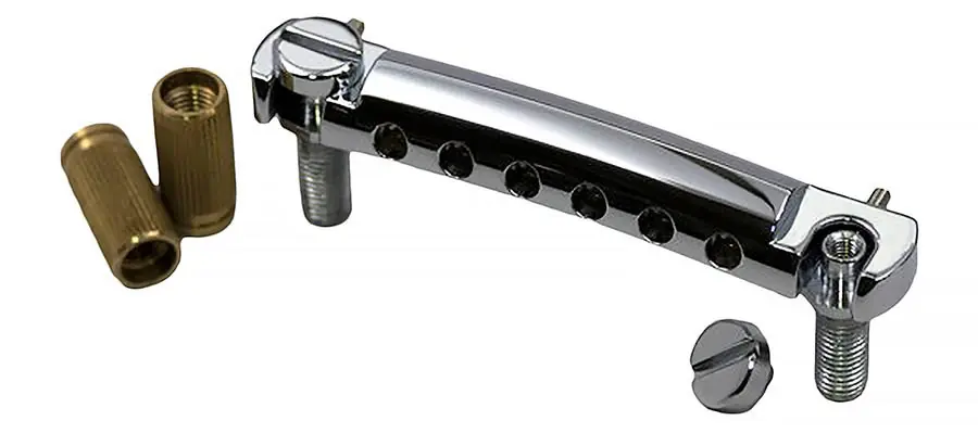 – wraparound tailpiece for Tune-O-Matic bridges- made of aluminum for true 50’s vintage feeling and improved extra resonant quality- exceptional intonation and increased harmonic overtones- mounting studs with US thread (imperial)- 82.0 mm (3.228″) stud distance- incl. TonePros SS1 Locking Studs (TP SS1 C)- incl. hex key- chrome finish