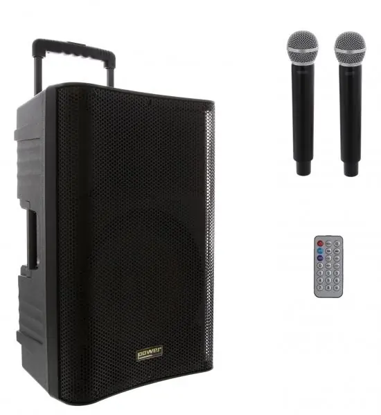 The Power Acoustics Taky 12 Media is a portable MP3 PA + 2 UHF handheld microphones.The TAKY 12 MEDIA is a portable PA system from POWER ACOUSTICS, specially designed to provide sound for a wide range of events. It has a rechargeable battery, a retractable trolley with wheels and 2 UHF wireless handheld microphones. It will be perfect for all types of conferences, speeches, dance classes, school events or various presentations.