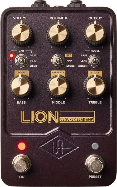 Get the iconic plexi tones that powered bands like Jimi Hendrix, Led Zeppelin, AC/DC, Van Halen with the UNIVERSAL AUDIO UAFX Lion ’68 Super Lead Amp modeling compact effect pedal. Also features stereo outputs and cabinet emulation with multiple speakers, cabinets, and boosts, live and preset modes, customization with the UAFX mobile app.Built on powerful dual-engine processing and world-class UAD modeling, Lion ‘68 is the only pedal that delivers the dead-on tones of three distinct 100-watt plexi amplifiers — for gorgeous cleans, aggressive breakup, and hot-rodded roar. Whether it’s replacing your amp rig and going direct to front-of-house, or recording tracks into your DAW — Lion ’68 gives you the inspiring, album-ready tones of three expertly miked “golden unit” 100-watt plexi amp heads — with sonic realism far beyond other digital modelers — within seconds.- Looking for less aggression with a spongier attack and more clean headroom ? Lion ’68’s Super Bass will get you there, with a jaw-dropping emulation of this classic plexi variant — perfect for auditioning overdrives, fuzzes, reverbs, and more.- The guitar tone on Van Halen is ground zero for “hot-rodded” Super Lead tones. From the sag of a voltage-starved Super Lead amp to the split Celestion 25-watt “Greenback”/JBL D-120F 4×12 cabinet, you’ll get the meaty sizzle, softer attack, and string-to-string definition that inspired generations of guitarists with theBrown (Modified Super Lead) algorythm.- Lion ’68 lets you take your crunch and searing lead tones further with tried-and-true boost recipes — including a Maestro EP-III preamp, Boss GE-10 ten-band EQ, and classic Variac and bias adjustments — at the turn of a knob.**Customize your Sound with the UAFX AppUsing the same Dynamic Speaker Modeling technology as Ox Amp Top Box, Lion ’68 Super Lead gives you the authentic thump of six classic speaker cabinet setups, with perfectly placed studio mics and dynamic room sounds :- GB25: (Late ’60s Marshall w/ vintage Celestion 25-watt “Greenbacks”)- GB30: (Marshall “100” birch cab w/ Celestion 30-watt “Greenbacks”)- JB|GB: (Two Celestion 25-watt “Greenbacks” / Two JBL D-120 Fs- 1×12 Electro-Voice EVM12*- 2×12 (Two-Rock Extension cab w/Celestion G12M-65 Creambacks)*- 4×12 (Marshall 1960 TV cab w/ Celestion Vintage 30s)**Available with UAFX Control app.Lion ’68 gets even better with the UAFX Control mobile app. Tweak the onboard noise gate, download custom tones, recall and archive your presets, and dive deeper into the sound that spans generations.