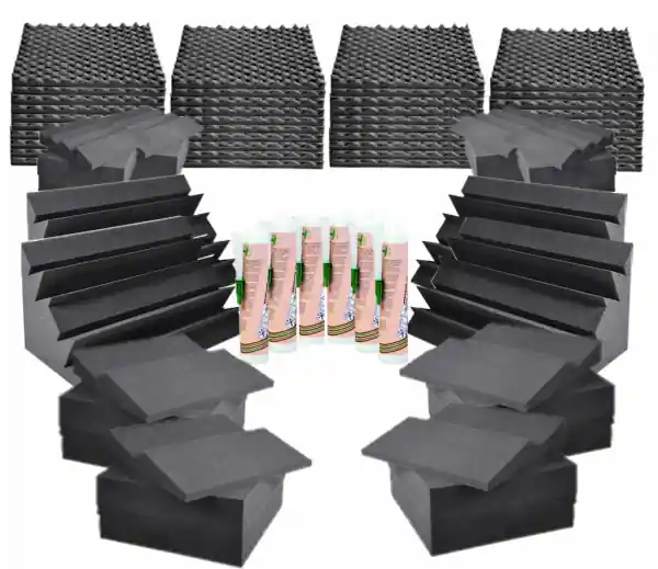 The Power Studio foam Kit v2.Pack: 4x FOAM 100 + 4x FOAM 30 + 4x FOAM 40 + 4x FOAM BASS 60 + 6 adhesives.0The STUDIO FOAM KIT V2 is a foam pack specially designed to treat the acoustics of a studio or home studio. Indeed, it is essential to carry out this operation in order to proceed with sound recordings and various studio operations (mixing and listening). The STUDIO FOAM KIT V2 is composed of FOAM 100, FOAM BASS 60, FOAM 40 and FOAM 30 which are glued to the various walls of the room as well as six tubes of neoprene glue.