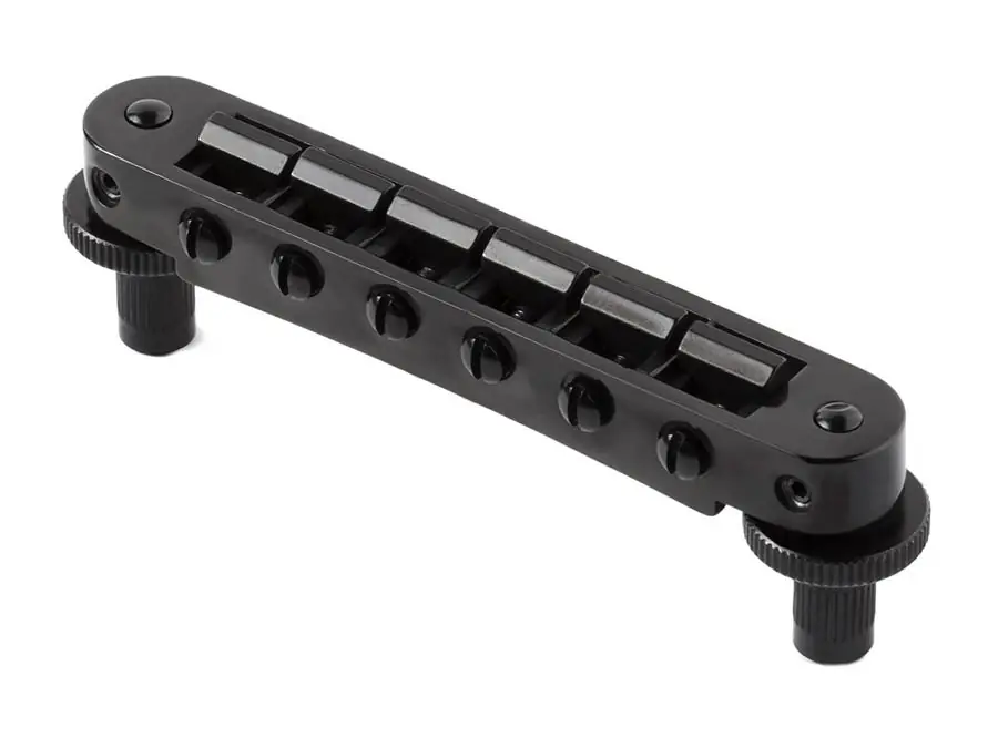 – Tune-O-Matic bridge for electric guitars- locking Nashville style bridge allows precise adjustment of the intonation and scale through lockable saddles- retrofits most LP- and SG-style USA guitars without modification- intonation adjustment on the pickup side- small posts- un-notched saddles for professional installation- standard US threaded inserts- can be fit with many standard sized Piezo, aftermarket graphite, or exotic saddle materials- 73.8 mm (2.905″) post distance- 51.5 mm (2.027″) string spacing- incl. hex key- black finish